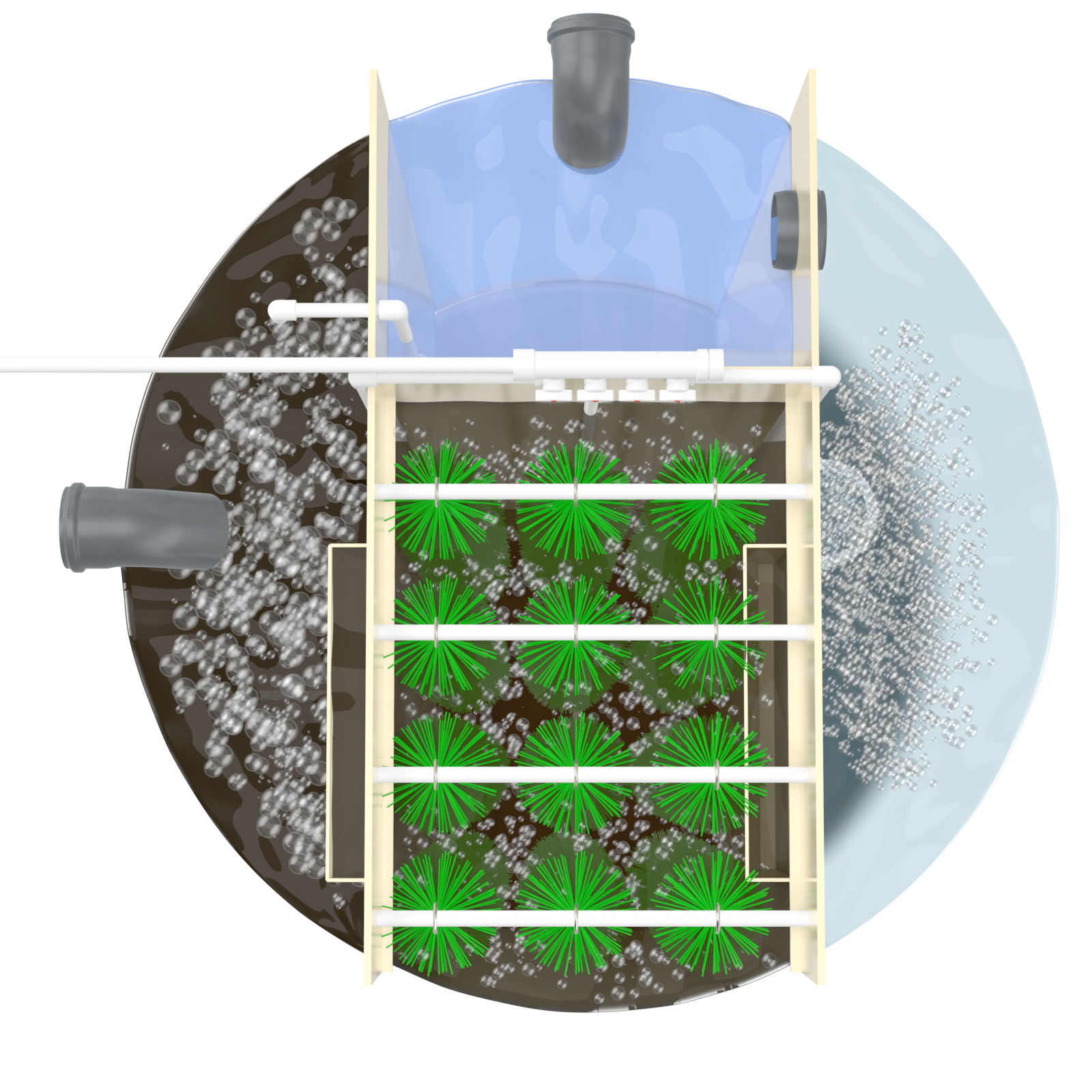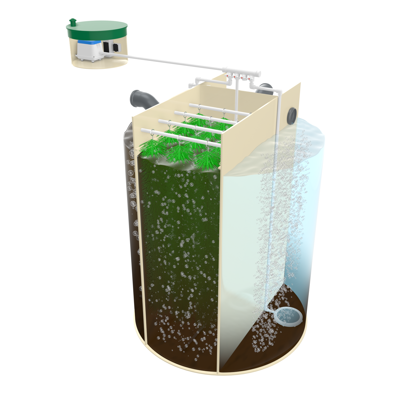 Комплектуется электрической силовой установкой типа компрессор. Переработка сточных вод осуществляется в раздельном аэро и био-ректоре, перфорированный лазером модуль, обеспечивает мелкопузырчатую аэрацию и насыщение воды кислородом. Такое инженерное решение обеспечивает более эффективную переработку сточных вод.