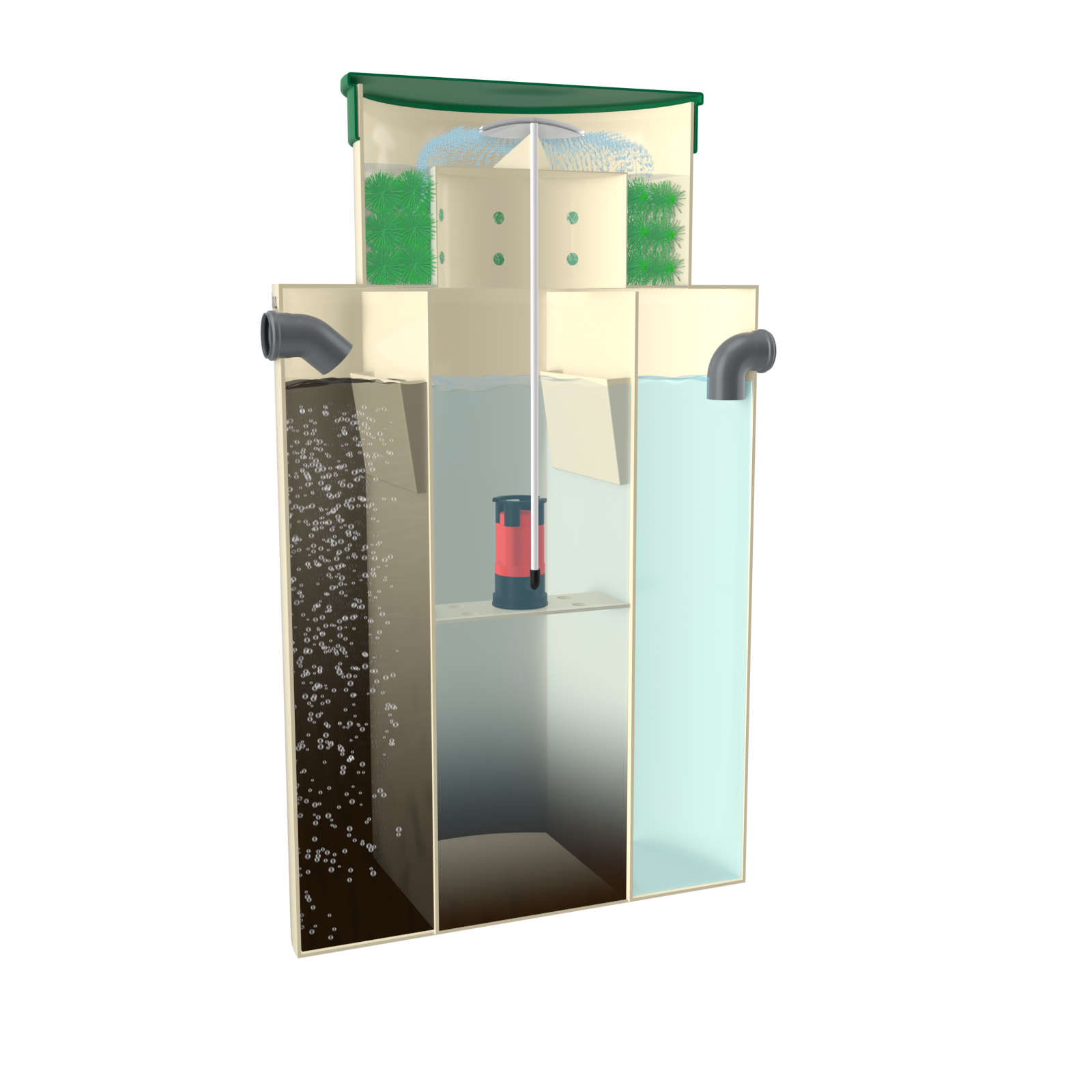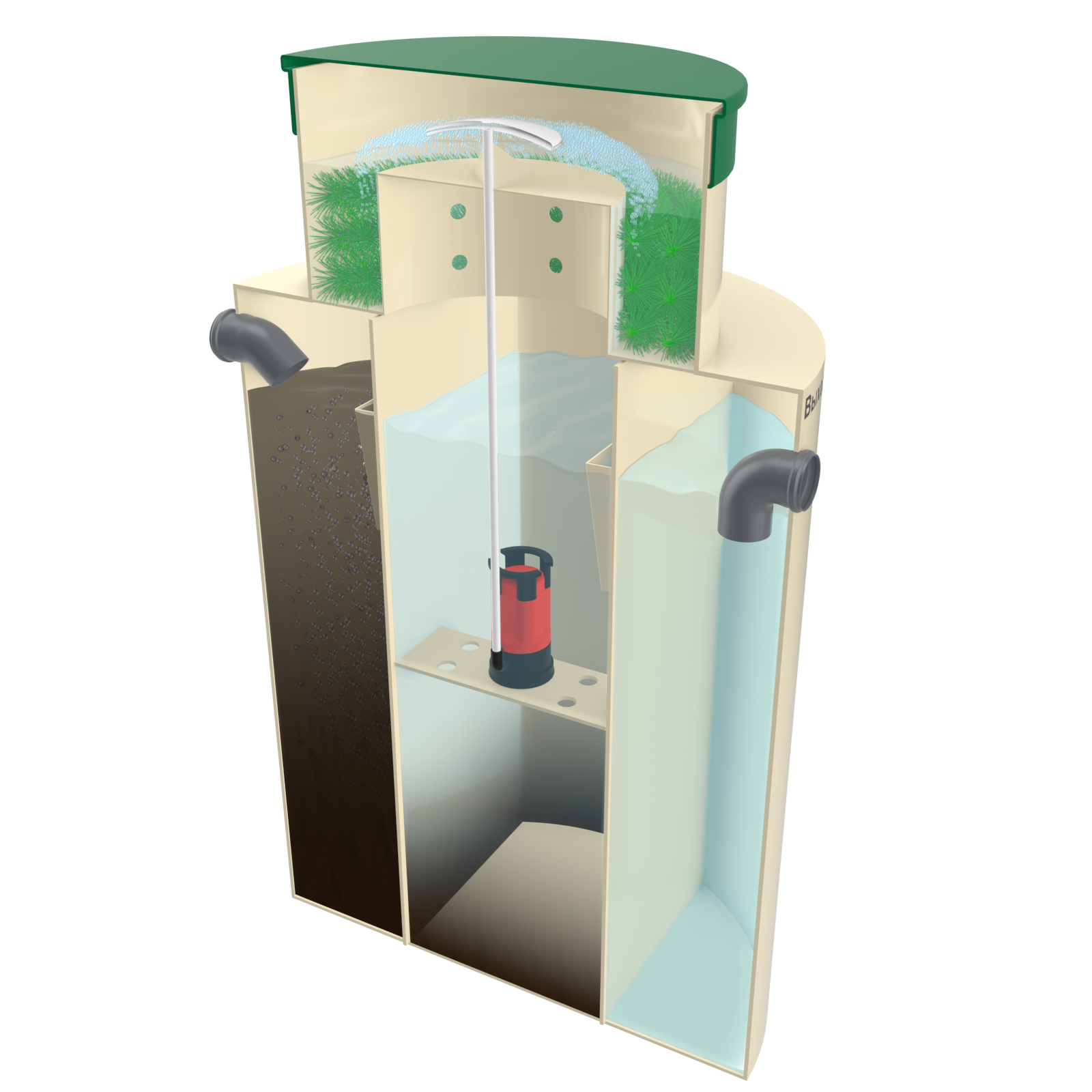 Автономная канализация серии "ОМЕГА" - это станция биологической очистки бытовых сточных вод, выполнена по финской технологии. Станция оснащена системой распыления сточных вод - «сплинкер», которая находится в аэро-реакторе, где располагается биомасса (аэробные бактерии), способствующие разложению сточных вод. За счет аэрации и насыщения воды кислородом ускоряются окислительные процессы. Благодаря этому достигаются наилучшие показатели очистки сточных вод. Станция четырехкамерная, имеет вертикальную цилиндрическую форму. Данная станция обладает низким энергопотреблением в отличие от аналогов. Электрическая часть работает не постоянно, а лишь 15 минут из часового цикла.